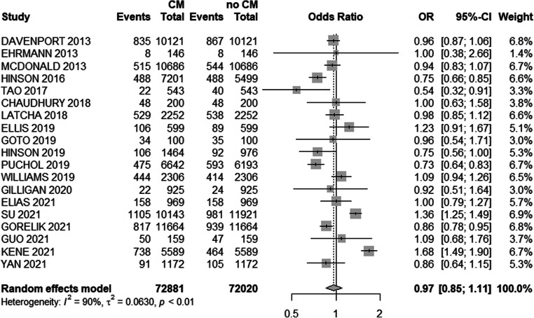 Results: Twenty-one articles were included, comprising data of 169,455 patients. The overall risk of AKI was similar in the contrast-enhanced and unenhanced groups (OR: 0.97 [95% CI: 0.85; 1.11], p = 0.64), regardless of baseline renal function and underlying disease. Substantial heterogeneity was detected (I2 = 90%, p ≤ 0.0001). Multivariable logistic regression identified hypertension (p = 0.03) and estimated glomerular filtration rate (eGFR) ≤ 30 mL/min/1.73 m2 (p = 0.0001) as factors associated with greater risk of post-contrast AKI.