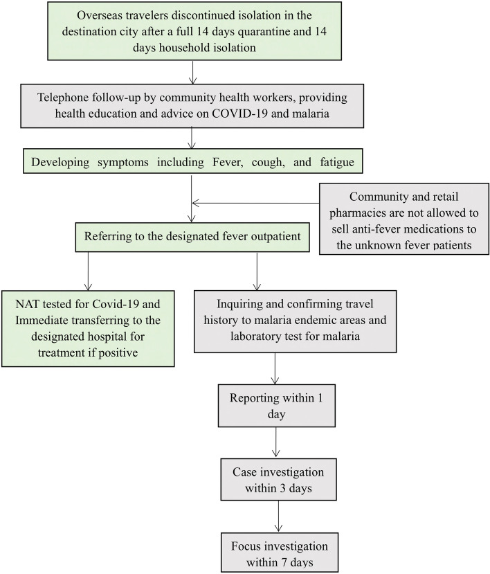 Results: From 01 August 2020 to 31 May 2021, 8,947 overseas travelers with Yangzhou as the final destination underwent 14-day managed quarantine and 14-day home isolation. Of these travelers, 5,562 were from malaria-endemic regions. A total of 26,026 education booklets and materials were distributed to expand malaria-related knowledge. Twenty-two patients with unknown fever were screened for malaria with rapid diagnostic tests, and one patient was confirmed to have imported malaria. The challenges associated with the implementation of the integrated malaria surveillance and case management program include neglect of malaria due to COVID-19, lack of a standard operating procedure for malaria screening, mobility of public health providers, and difficulties in respecting the timeline of the "1-3-7" surveillance strategy.
