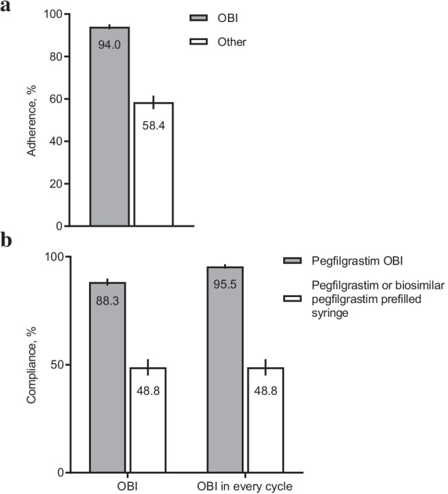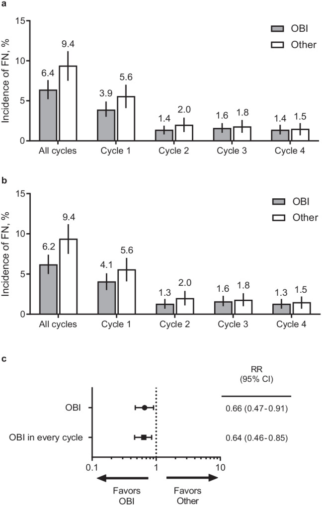 Results: This US study enrolled 2575 eligible patients (OBI, 1624; Other, 951). FN incidence was lower in the OBI group (6.4% [95% CI, 5.2-7.6%]) than in the Other group (9.4% [7.5-11.2%]), with a relative risk (RR) of 0.66 (0.47-0.91; p = .006). A decreased risk of dose delays among patients receiving pegfilgrastim OBI vs Other was observed (RR for ≥ 5 days: 0.64 [0.42-0.96], p = .023; RR for ≥ 7 days: 0.62 [0.40-0.91], p = .016). Adherence, defined as G-CSF support for all chemotherapy cycles, was 94.0% (92.9-95.2%) in the OBI group compared with 58.4% (55.2-61.5%) in the Other group. Compliance with pegfilgrastim, defined as administration the day after chemotherapy, was 88.3% in the OBI group and 48.8% in the prefilled syringe group.