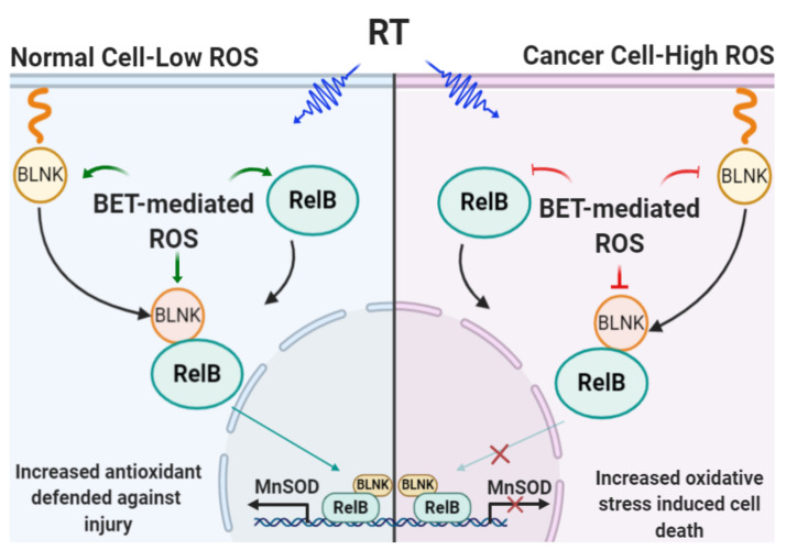 Aberrant levels of reactive oxygen species (ROS) are potential mechanisms that contribute to both cancer therapy efficacy and the side effects of cancer treatment. Upregulation of the non-canonical redox-sensitive NF-kB family member, RelB, confers radioresistance in prostate cancer (PCa). We screened FDA-approved compounds and identified betamethasone (BET) as a drug that increases hydrogen peroxide levels in vitro and protects non-PCa tissues/cells while also enhancing radiation killing of PCa tissues/cells, both in vitro and in vivo. Significantly, BET increases ROS levels and exerts different effects on RelB expression in normal cells and PCa cells. BET induces protein expression of RelB and RelB target genes, including the primary antioxidant enzyme, manganese superoxide dismutase (MnSOD), in normal cells, while it suppresses protein expression of RelB and MnSOD in LNCaP cells and PC3 cells. RNA sequencing analysis identifies B-cell linker protein (BLNK) as a novel RelB complementary partner that BET differentially regulates in normal cells and PCa cells. RelB and BLNK are upregulated and correlate with the aggressiveness of PCa in human samples. The RelB-BLNK axis translocates to the nuclear compartment to activate MnSOD protein expression. BET promotes the RelB-BLNK axis in normal cells but suppresses the RelB-BLNK axis in PCa cells. Targeted disruptions of RelB-BLNK expressions mitigate the radioprotective effect of BET on normal cells and the radiosensitizing effect of BET on PCa cells. Our study identified a novel RelB complementary partner and reveals a complex redox-mediated mechanism showing that the RelB-BLNK axis, at least in part, triggers differential responses to the redox-active agent BET by stimulating adaptive responses in normal cells but pushing PCa cells into oxidative stress overload.