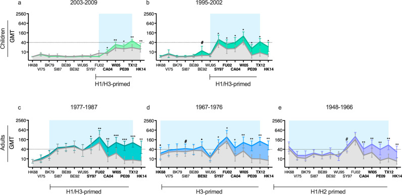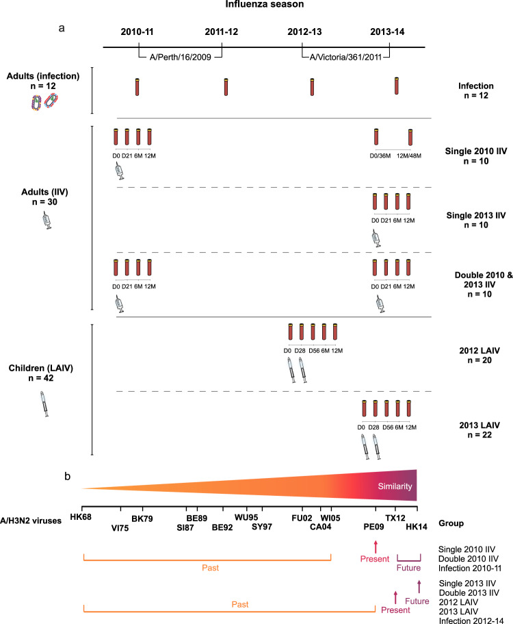 History of influenza A/H3N2 exposure, especially childhood infection, shape antibody responses after influenza vaccination and infection, but have not been extensively studied. We investigated the breadth and durability of influenza A/H3N2-specific hemagglutinin-inhibition antibodies after live-attenuated influenza vaccine in children (aged 3-17 years, n = 42), and after inactivated influenza vaccine or infection in adults (aged 22-61 years, n = 42) using 14 antigenically distinct A/H3N2 viruses circulating from 1968 to 2018. We found that vaccination and infection elicited cross-reactive antibody responses, predominantly directed against newer or future strains. Childhood H3-priming increased the breadth and magnitude of back-boosted A/H3N2-specific antibodies in adults. Broader and more durable A/H3N2-specific antibodies were observed in repeatedly vaccinated adults than in children and previously unvaccinated adults. Our findings suggest that early A/H3N2 exposure and frequent seasonal vaccination could increase the breadth and seropositivity of antibody responses, which may improve vaccine protection against future viruses.