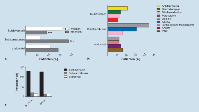 Material und methoden: Die Studienkohorte umfasst 1030 Patienten, die in den Jahren1999–2019 aufgrund einer akuten Vergiftung auf die medizinische Intensivstation der Uniklinik RWTH Aachen aufgenommen wurden. Demographische und klinische Merkmale sowie das klinische Management wurden detailliert analysiert und zwischen alters- und geschlechtsspezifischen Untergruppen verglichen.
