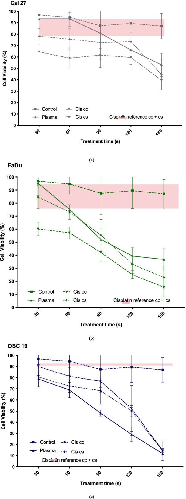 Results: In all cell lines, 120 s of CAP exposure resulted in a significant reduction of cell viability. DNA damage significantly increased after 60 s. Combined treatment of cells with CAP and low dose cisplatin showed additive effects. A possible sensitivity to cisplatin could be restored in Cal 27 cells by CAP application.