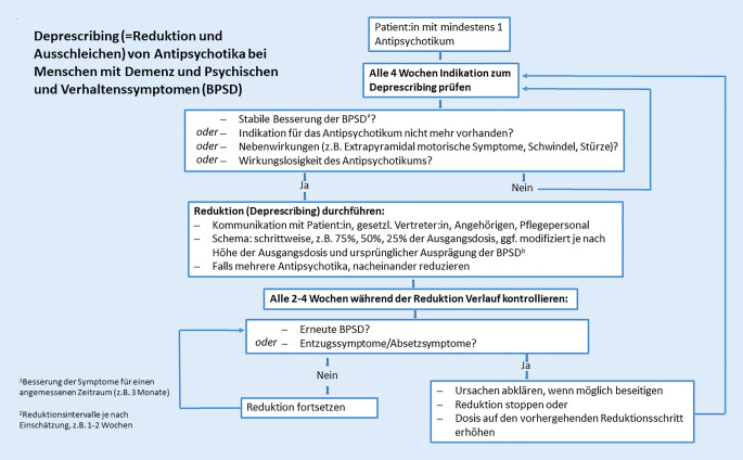 Diskussion: In Deutschland gibt es bislang keine konkreten Empfehlungen zur Vorgehensweise bei Reduktion und Absetzen von Antipsychotika, die zur Behandlung von BPSD bei Menschen mit Demenz eingesetzt werden. Die vorgelegte Arbeit soll als Handlungsempfehlung für Haus- und Fachärzt:innen dienen. Bei den Empfehlungen handelt es sich um keine Leitlinien, sie ersetzen nicht die Eigenverantwortlichkeit der Behandelnden und das individuell notwendige Vorgehen in Abhängigkeit von der Behandlungssituation.