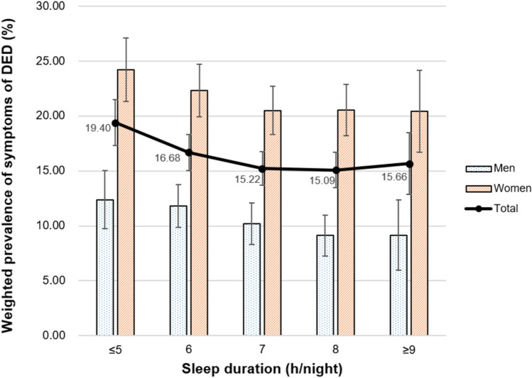 Dry eye disease (DED) is a multifactorial disease of the ocular surface causing severe discomfort, mild ocular irritation, fatigue, pain, visual disturbance, and foreign body sensation. Stress, depression, and sleep disorders are risk factors for DED. We aimed to investigate the association between DED symptoms and composite factors related to mental health (combined sleep duration, psychological stress perception, and history of depressed mood) in Korean adults aged ≥ 20 years in a population-based study using the 2010-2012 Korea National Health and Nutrition Examination Survey data. Symptoms of DED and data on mental health were obtained using questionnaires. Multiple logistic regression analysis was conducted to examine the association between mental health and DED, and adjusted for possible covariates. Subjects with symptoms of DED were more likely to experience short sleep duration, psychological stress perception, and a history of depressed mood [odds ratio (OR) = 1.42, 95% confidence interval (CI) 1.06-1.90; OR = 1.71, 95% CI 1.37-2.14; and OR = 1.37, 95% CI 1.06-1.77, respectively] even after correcting for demographic factors, lifestyle factors, and medical factors. Additionally, participants with symptoms of DED were more likely to experience composite factors related to mental health (OR = 1.91, 95% CI 1.07-3.39). Therefore, ophthalmologists may report difficulties in both sleep and mental health in patients with DED.