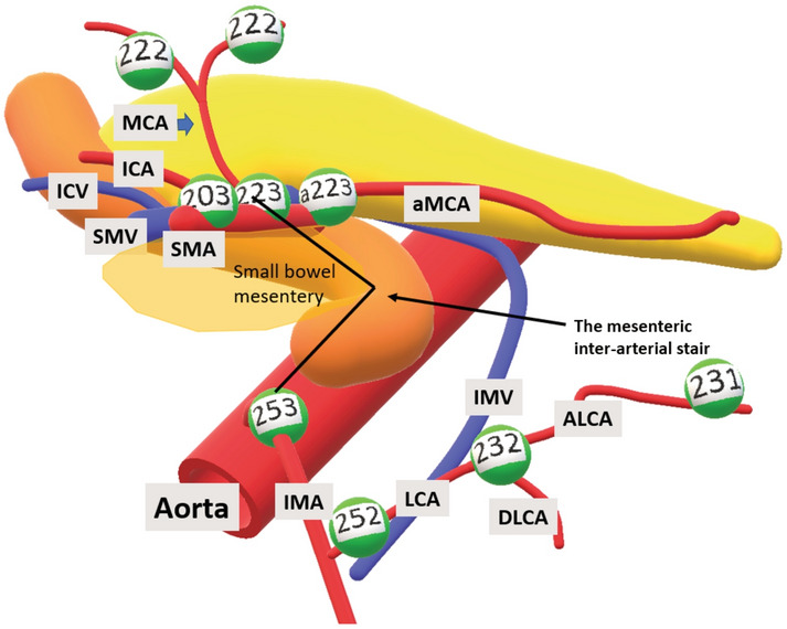 Results: Our first major finding was the difference in level between the middle colic and the inferior mesenteric artery origins. We have named this relationship a mesenteric inter-arterial stair. The middle colic artery origin could be found cranial (median 3.38 cm) or caudal (median 0.58 cm) to the inferior mesenteric artery. The lateral distance between the two origins was 2.63 cm (median), and the straight distance 4.23 cm (median). The second finding was the different trajectories and confluence pattern of the inferior mesenteric vein. This vein ended in the superior mesenteric/jejunal vein (21 patients) or in the splenic vein (11 patients). The inferior mesenteric vein confluence could be infrapancreatic (17 patients), infrapancreatic with retropancreatic arch (7 patients) or retropancreatic (8 patients). Lastly, the accessory middle colic artery was present in ten patients presenting another pathway for lymphatic dissemination.