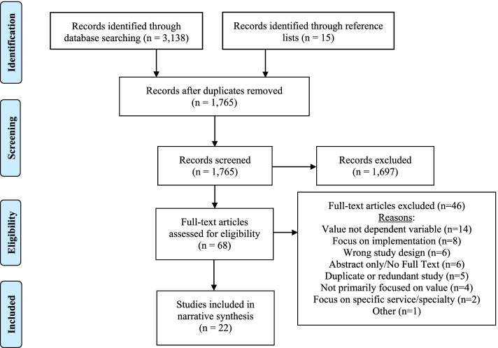 Methods: Searches of PubMed, Embase, Google Scholar, Policy File, and SCOPUS were conducted between February and March 2020. Empirical studies that explored associations between any range of factors and value (loosely defined as quality or outcomes relative to cost) were eligible for inclusion. We created a template in Microsoft Excel for data extraction and evaluated the quality of included articles using the Critical Appraisal Skills Programme (CASP) quality appraisal tool. Data was synthesized using narrative methods.