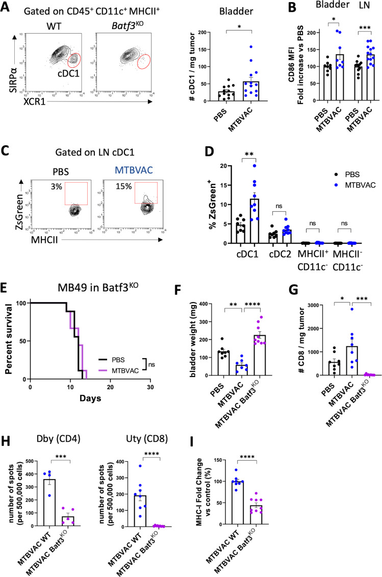 Results: We found that the expression of the BCG-absent proteins ESAT6/CFP10 by MTBVAC was determinant in mediating bladder colonization by the bacteria, which correlated with augmented antitumoral efficacy. We further analyzed the mechanism of action of bacterial immunotherapy and found that it critically relied on the adaptive cytotoxic response. MTBVAC enhanced both tumor antigen-specific CD4+ and CD8+ T-cell responses, in a process dependent on stimulation of type 1 conventional dendritic cells. Importantly, improved intravesical bacterial immunotherapy using MBTVAC induced eradication of fully established bladder tumors, both as a monotherapy and specially in combination with the immune checkpoint inhibitor antiprogrammed cell death ligand 1 (anti PD-L1).