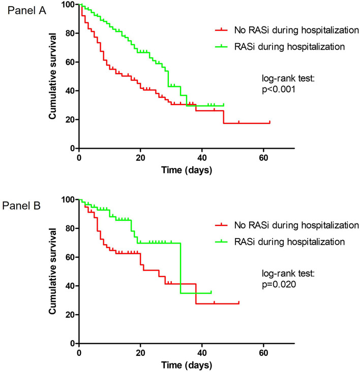 Results: The mean age was 87.4 ± 6.1 years. Patients taking RASi at home were 147 (43.6%). During hospitalization, 38 patients (11.3% of the entire study population) discontinued RASi, while 57 patients (16.9% of the entire study population) started RASi. In-hospital mortality was 43.9%. Patients taking RASi during hospitalization (patients who maintained their home RASi therapy + patients who started RASi during hospitalization) had a significantly lower in-hospital mortality than untreated patients [HR 0.48 (95% CI: 0.34-0.67)], even after adjustment for required respiratory support, functional status, albumin, inflammation, and cardiac biomarkers. The analysis of the groups derived from the "propensity score matching" (58 patients in each group) confirmed these results [HR 0.46 (95% CI: 0.23-0.91)].