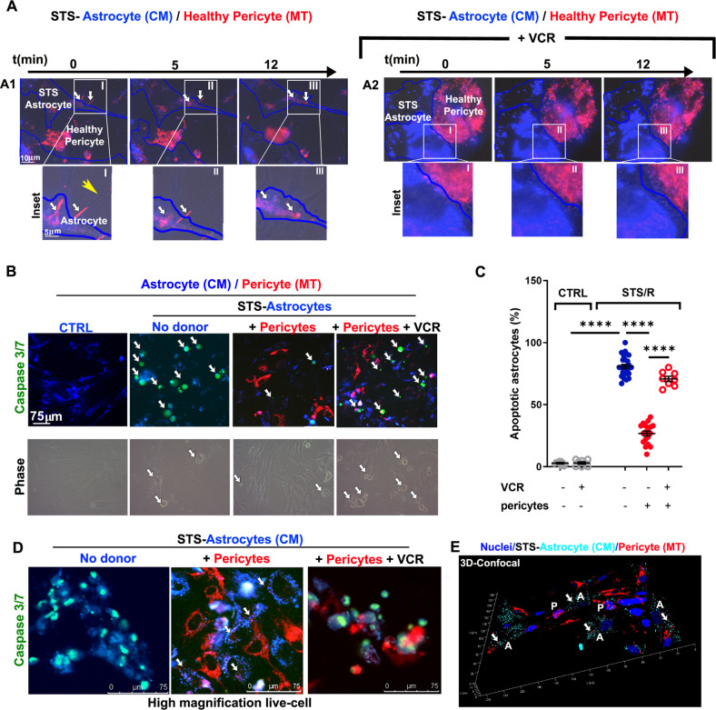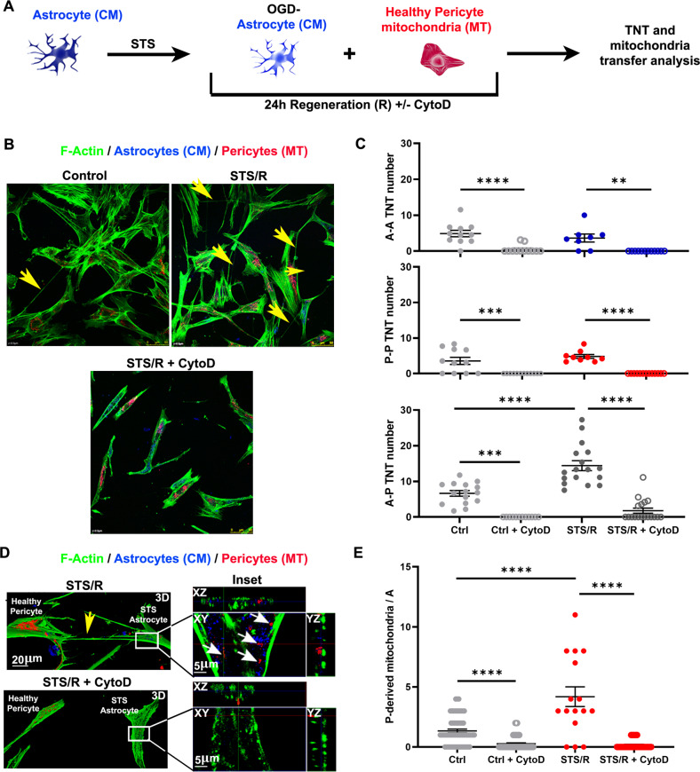 Crosstalk mechanisms between pericytes, endothelial cells, and astrocytes preserve integrity and function of the blood-brain-barrier (BBB) under physiological conditions. Long intercellular channels allowing the transfer of small molecules and organelles between distant cells called tunneling nanotubes (TNT) represent a potential substrate for energy and matter exchanges between the tripartite cellular compartments of the BBB. However, the role of TNT across BBB cells under physiological conditions and in the course of BBB dysfunction is unknown. In this work, we analyzed the TNT's role in the functional dialog between human brain endothelial cells, and brain pericytes co-cultured with human astrocytes under normal conditions or after exposure to ischemia/reperfusion, a condition in which BBB breakdown occurs, and pericytes participate in the BBB repair. Using live time-lapse fluorescence microscopy and laser-scanning confocal microscopy, we found that astrocytes form long TNT with pericytes and endothelial cells and receive functional mitochondria from both cell types through this mechanism. The mitochondrial transfer also occurred in multicellular assembloids of human BBB that reproduce the three-dimensional architecture of the BBB. Under conditions of ischemia/reperfusion, TNT formation is upregulated, and astrocytes exposed to oxygen-glucose deprivation were rescued from apoptosis by healthy pericytes through TNT-mediated transfer of functional mitochondria, an effect that was virtually abolished in the presence of TNT-destroying drugs. The results establish a functional role of TNT in the crosstalk between BBB cells and demonstrate that TNT-mediated mitochondrial transfer from pericytes rescues astrocytes from ischemia/reperfusion-induced apoptosis. Our data confirm that the pericytes might play a pivotal role in preserving the structural and functional integrity of BBB under physiological conditions and participate in BBB repair in brain diseases.