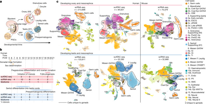 Gonadal development is a complex process that involves sex determination followed by divergent maturation into either testes or ovaries1. Historically, limited tissue accessibility, a lack of reliable in vitro models and critical differences between humans and mice have hampered our knowledge of human gonadogenesis, despite its importance in gonadal conditions and infertility. Here, we generated a comprehensive map of first- and second-trimester human gonads using a combination of single-cell and spatial transcriptomics, chromatin accessibility assays and fluorescent microscopy. We extracted human-specific regulatory programmes that control the development of germline and somatic cell lineages by profiling equivalent developmental stages in mice. In both species, we define the somatic cell states present at the time of sex specification, including the bipotent early supporting population that, in males, upregulates the testis-determining factor SRY and sPAX8s, a gonadal lineage located at the gonadal-mesonephric interface. In females, we resolve the cellular and molecular events that give rise to the first and second waves of granulosa cells that compartmentalize the developing ovary to modulate germ cell differentiation. In males, we identify human SIGLEC15+ and TREM2+ fetal testicular macrophages, which signal to somatic cells outside and inside the developing testis cords, respectively. This study provides a comprehensive spatiotemporal map of human and mouse gonadal differentiation, which can guide in vitro gonadogenesis.