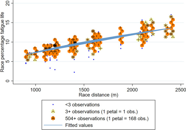Fatigue life (FL) is the number of cycles of load sustained by a material before failure, and is dependent on the load magnitude. For athletes, 'cycles' translates to number of strides, with load proportional to speed. To improve previous investigations estimating workload from distance, we used speed (m/s, x) per stride collected using 5 Hz GPS/800 Hz accelerometer sensors as a proxy for limb load to investigate factors associated with FL in a Thoroughbred race start model over 25,234 race starts, using a combination of mathematical and regression modelling. Fore-limb vertical force (NKg-1) was estimated using a published equation: Vertical force = 2.778 + 2.1376x - 0.0535x2. Joint load (σ) was estimated based on the vertical force, scaled according to the maximum speed and defined experimental loads for the expected variation in load distribution across a joint surface (54-90 MPa). Percentage FL (%FL) was estimated using a published equation for cycles to failure (Nf) summed across each race start: Nf = 10(σ-134.2)/-14.1. Multivariable mixed-effects linear regression models were generated on %FL, adjusting for horse-level clustering, presented as coefficients; 95%CI. Scaled to the highest joint load, individual starts accrued a mean of 9.34%FL (sd. 1.64). Older age (coef. 0.03; 0.002-0.04), longer race-distances (non-linear power transformed), and firmer track surfaces (ref. Heavy 10: Good 3 coef. 2.37; 2.26-2.48) were associated with greater %FL, and males accrued less than females (p < 0.01). Most variables associated with %FL are reported risk factors for injury. Monitoring strides in racehorses may therefore allow identification of horses at risk, enabling early detection of injury.