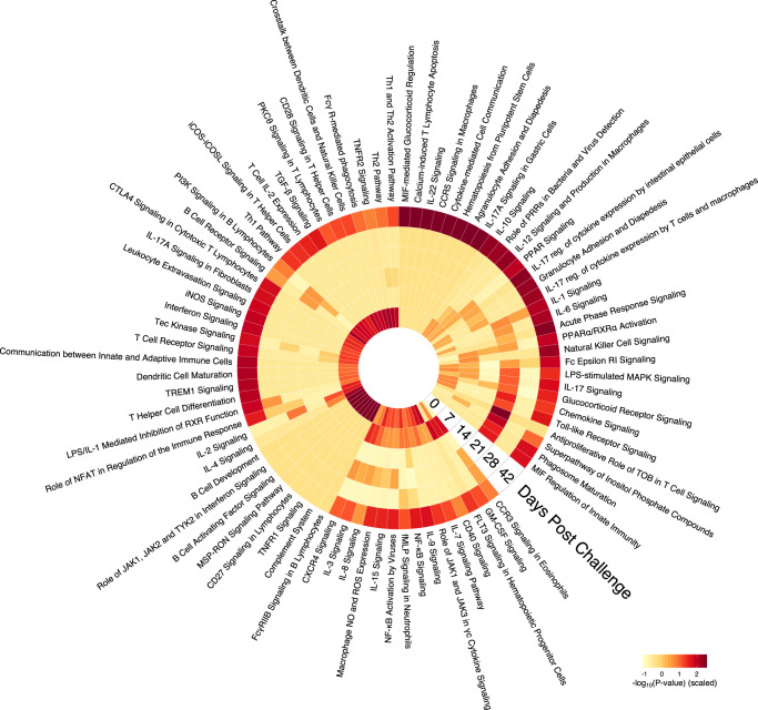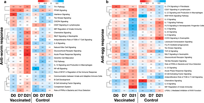 Individuals vary broadly in their response to vaccination and subsequent challenge infection, with poor vaccine responders causing persistence of both infection and transmission in populations. Yet despite having substantial economic and societal impact, the immune mechanisms that underlie such variability, especially in infected tissues, remain poorly understood. Here, to characterise how antihelminthic immunity at the mucosal site of infection developed in vaccinated lambs, we inserted gastric cannulae into the abomasa of three-month- and six-month-old lambs and longitudinally analysed their local immune response during subsequent challenge infection. The vaccine induced broad changes in pre-challenge abomasal immune profiles and reduced parasite burden and egg output post-challenge, regardless of age. However, age affected how vaccinated lambs responded to infection across multiple immune pathways: adaptive immune pathways were typically age-dependent. Identification of age-dependent and age-independent protective immune pathways may help refine the formulation of vaccines, and indicate specificities of pathogen-specific immunity more generally.