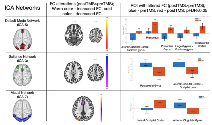 Materials and methods: A total of 19 patients with episodic migraine without aura underwent a 5-day course of rTMS of the fronto-temporo-parietal junction bilaterally, at 10 Hz frequency and 60% of motor threshold response of 900 pulses. Resting-state functional MRI (1.5 T) and a battery of tests were carried out for each patient to clarify their diagnosis, qualitative and quantitative characteristics of pain, and associated affective symptoms. Changes in functional connectivity (FC) in the brain's neural networks before and after the treatment were identified through independent components analysis.
