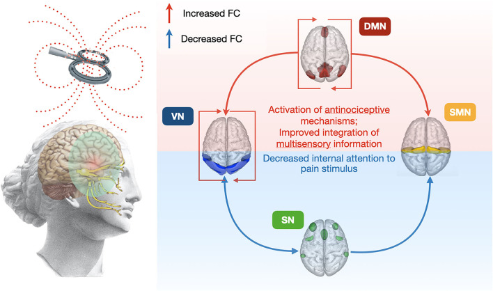 Conclusions: Our results show that a 5-day course of rTMS significantly alters the connectivity of brain networks associated with pain and antinociceptive brain systems in about 70% of cases, which may shed light on the neural mechanisms underlying migraine treatment with rTMS.