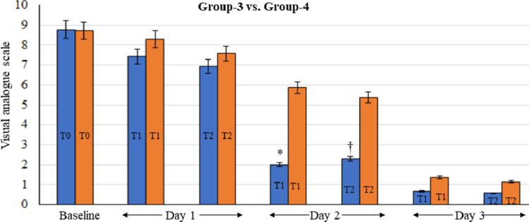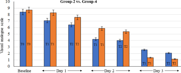 Results: In all, 14, 13, 14, and 14 individuals with AO were included in groups 1, 2, 3 and 4, respectively. All patients had undergone extraction of mandibular third molars. At baseline and on day 1, there was no difference in SPP in all groups. On days 2 and 3, mean visual analogue scale (VAS) scores at T1 (P < .01) and T2 (P < .01) intervals were significantly high in Group 2 compared with Group 3. On days 2 and 3, mean VAS scores at T1 (P < .01) and T2 (P < .01) intervals were significantly high in Group 4 compared with Group 3. There was no difference in SPP in groups 3 and 4 on day 3 at T0 and T1 intervals.