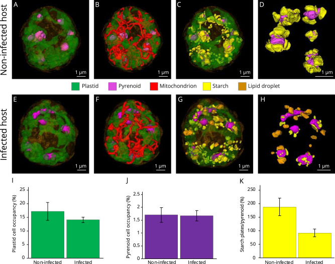 Parasites are widespread and diverse in oceanic plankton and many of them infect single-celled algae for survival. How these parasites develop and scavenge energy within the host and how the cellular organization and metabolism of the host is altered remain open questions. Combining quantitative structural and chemical imaging with time-resolved transcriptomics, we unveil dramatic morphological and metabolic changes of the marine parasite Amoebophrya (Syndiniales) during intracellular infection, particularly following engulfment and digestion of nutrient-rich host chromosomes. Changes include a sequential acristate and cristate mitochondrion with a 200-fold increase in volume, a 13-fold increase in nucleus volume, development of Golgi apparatus and a metabolic switch from glycolysis (within the host) to TCA (free-living dinospore). Similar changes are seen in apicomplexan parasites, thus underlining convergent traits driven by metabolic constraints and the infection cycle. In the algal host, energy-producing organelles (plastid, mitochondria) remain relatively intact during most of the infection. We also observed that sugar reserves diminish while lipid droplets increase. Rapid infection of the host nucleus could be a "zombifying" strategy, allowing the parasite to digest nutrient-rich chromosomes and escape cytoplasmic defense, whilst benefiting from maintained carbon-energy production of the host cell.