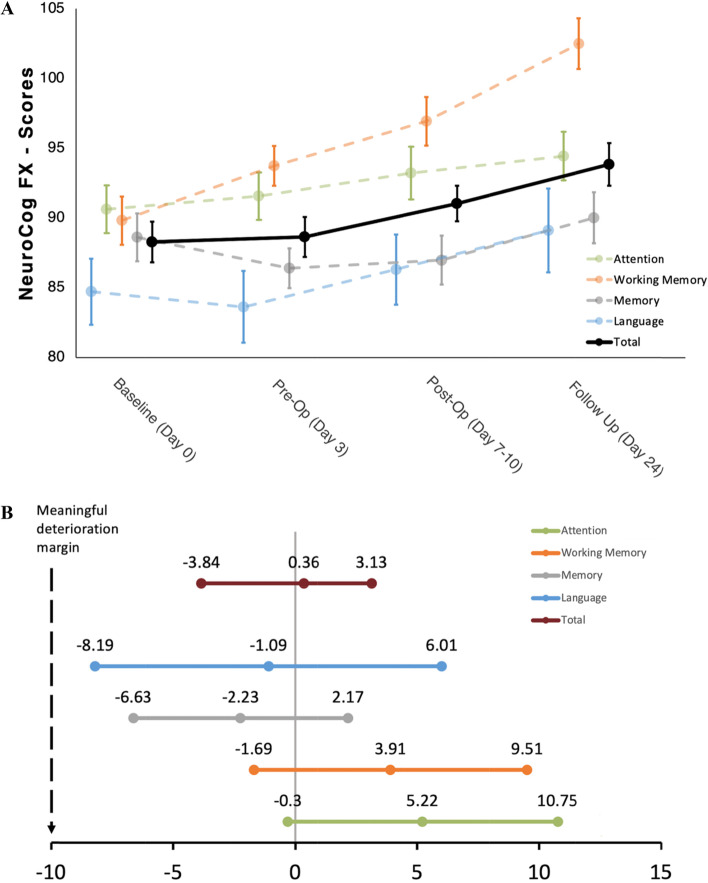 Methods: Fortythree patients with supratentorial brain tumor scheduled for surgery received LEV three days before until six days after surgery as seizure prophylaxis. Cognitive functioning (NeuroCogFX), LEV plasma-levels, hematotoxicity, side-effects, as well as health-related quality of life (HRQoL, Qolie31), were recorded preoperatively before (Baseline) and after onset of LEV (Pre-Op), 4-6 days postoperatively (Post-Op) and 21 days postoperatively (Follow-Up).