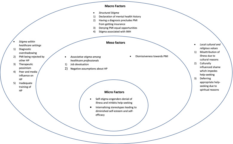 Results: The current study themes identified stigma-related factors that influence PMI's recovery from the perspectives of healthcare professionals working closely with PMI. These factors were organised into three overarching themes in a multilevel structure. The three themes were classified as Micro Factors (e.g., internalised stigma), Meso Factors (e.g., discrimination of people associated with the stigmatised group), and Macro Factors (e.g., structural stigma and stigma within healthcare settings).