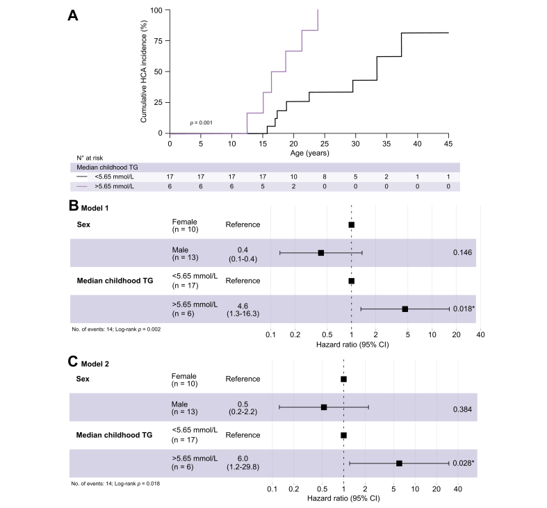 Conclusions: In patients with GSDIa, high childhood TG was associated with an increased risk of HCA, and earlier onset of HCA development, independent of sex-associated hypertriglyceridaemia, and G6PC1 genotype.