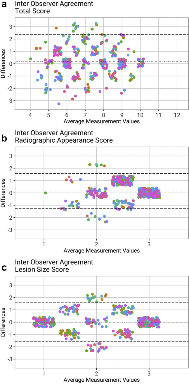 Methods: Forty-five patients with upper limb bony metastases met the inclusion criteria (62% male 28/45). The mean age was 69 years (SD 9.5), and the most common primaries were lung (29%, 13/45), followed by prostate and hematological (each 20%, 9/45). The most commonly affected bone was the humerus (76%, 35/45), followed by the ulna (6.5%, 3/45). Mirels' score was calculated in 32 patients; with plain radiographs at index presentation scored using Mirels' system by 6 raters. The radiological aspects (lesion size and appearance) were scored twice by each rater (2 weeks apart). Intraobserver and interobserver reliability were calculated using Fleiss' kappa test. Bland-Altman plots compared the variances of both individual components and the total Mirels' score.