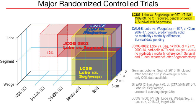 Results: In healthy patients there is no short-term benefit to sublobar resection vs. lobectomy in randomized and non-randomized comparisons. A detriment in long-term outcomes is demonstrated by adjusted non-randomized comparisons, more marked for wedge than segmentectomy. Quality-of-life data is confounded by the use of video-assisted approaches; evidence suggests the approach has more impact than the resection extent. Differences in pulmonary function tests by resection extent are not clinically meaningful in healthy patients, especially for multi-segmentectomy vs. lobectomy. The margin distance is associated with the risk of recurrence.