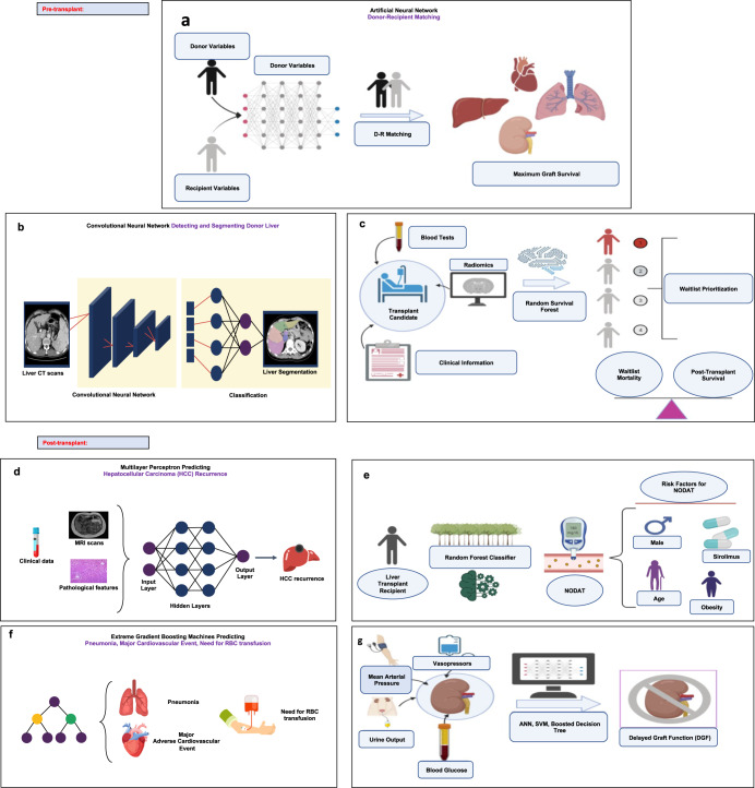 Solid-organ transplantation is a life-saving treatment for end-stage organ disease in highly selected patients. Alongside the tremendous progress in the last several decades, new challenges have emerged. The growing disparity between organ demand and supply requires optimal patient/donor selection and matching. Improvements in long-term graft and patient survival require data-driven diagnosis and management of post-transplant complications. The growing abundance of clinical, genetic, radiologic, and metabolic data in transplantation has led to increasing interest in applying machine-learning (ML) tools that can uncover hidden patterns in large datasets. ML algorithms have been applied in predictive modeling of waitlist mortality, donor-recipient matching, survival prediction, post-transplant complications diagnosis, and prediction, aiming to optimize immunosuppression and management. In this review, we provide insight into the various applications of ML in transplant medicine, why these were used to evaluate a specific clinical question, and the potential of ML to transform the care of transplant recipients. 36 articles were selected after a comprehensive search of the following databases: Ovid MEDLINE; Ovid MEDLINE Epub Ahead of Print and In-Process & Other Non-Indexed Citations; Ovid Embase; Cochrane Database of Systematic Reviews (Ovid); and Cochrane Central Register of Controlled Trials (Ovid). In summary, these studies showed that ML techniques hold great potential to improve the outcome of transplant recipients. Future work is required to improve the interpretability of these algorithms, ensure generalizability through larger-scale external validation, and establishment of infrastructure to permit clinical integration.