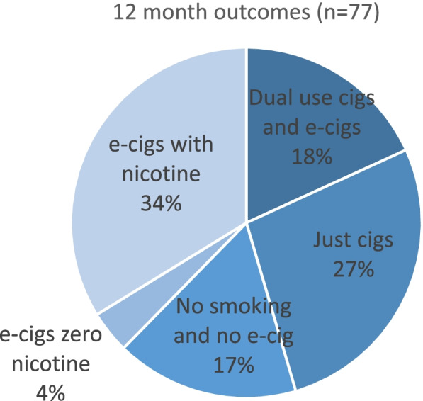Results: The four-week follow-up data suggest that for every twenty people given an e-cigarette, six quit smoking tobacco and three people cut their cigarette intake by more than five cigarettes per day. Long-term follow-up results were positive but only a small number of participants were still engaged with the study at 12 months. Service users and providers spoke positively about the combination of e-cigarettes and pharmacy support.