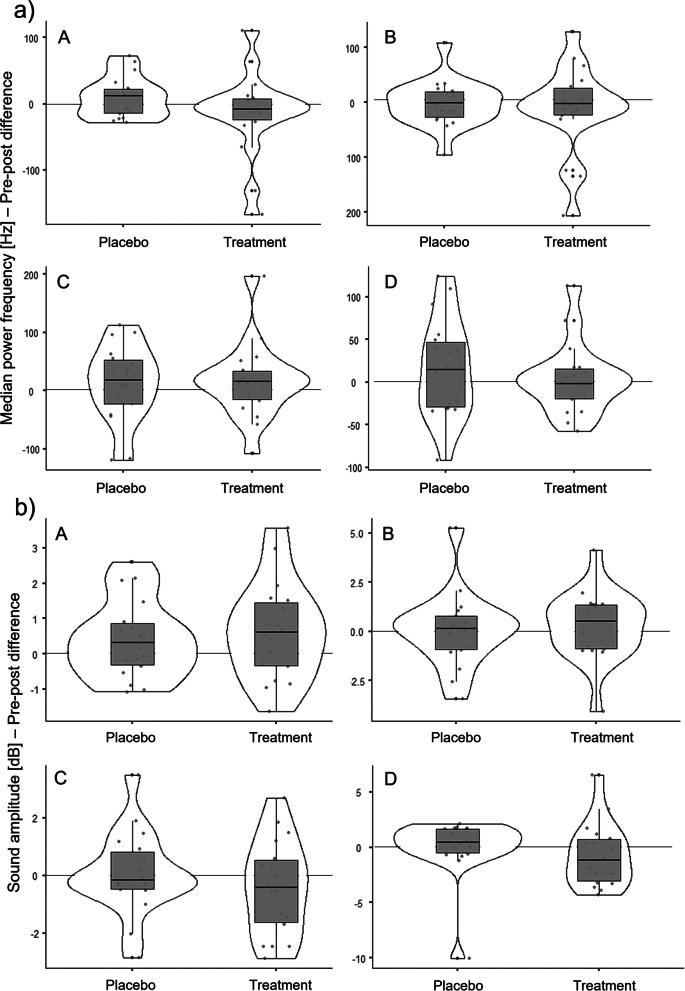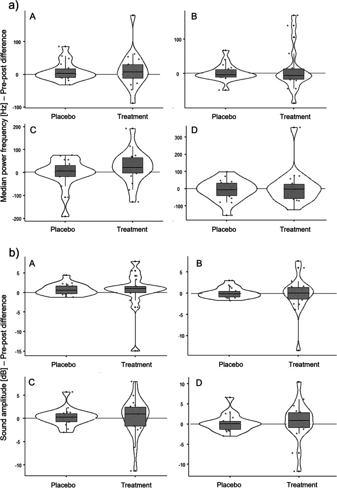Conclusion: The MPF pre-post differences of the exercise intervention were higher compared to the MPF pre-post differences of the placebo treatment. The amplitude pre-post differences were lower in the exercise intervention. In particular, the sound amplitude might be an indicator for therapy effects in persons with knee osteoarthritis.