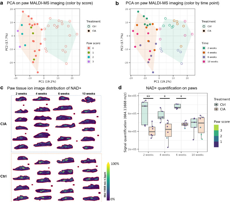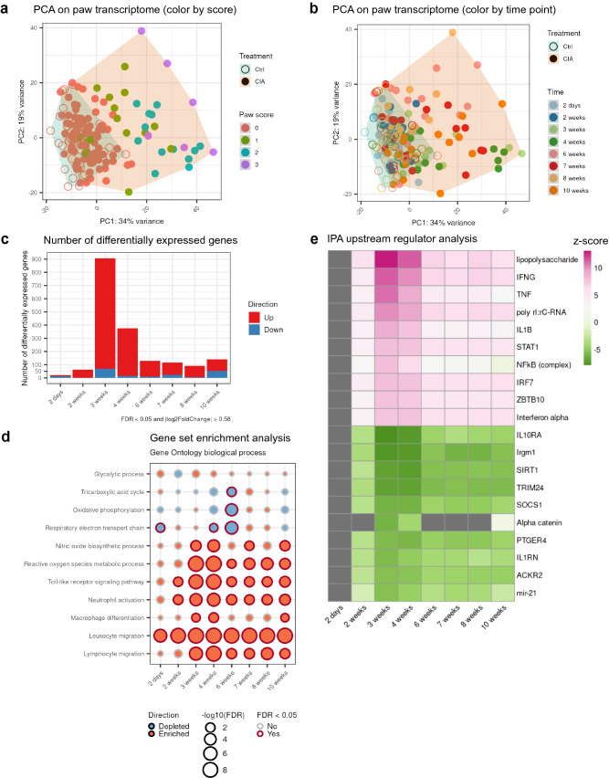 Rheumatoid arthritis (RA) is characterized by joint infiltration of immune cells and synovial inflammation which leads to progressive disability. Current treatments improve the disease outcome, but the unmet medical need is still high. New discoveries over the last decade have revealed the major impact of cellular metabolism on immune cell functions. So far, a comprehensive understanding of metabolic changes during disease development, especially in the diseased microenvironment, is still limited. Therefore, we studied the longitudinal metabolic changes during the development of murine arthritis by integrating metabolomics and transcriptomics data. We identified an early change in macrophage pathways which was accompanied by oxidative stress, a drop in NAD+ level and induction of glucose transporters. We discovered inhibition of SIRT1, a NAD-dependent histone deacetylase and confirmed its dysregulation in human macrophages and synovial tissues of RA patients. Mining this database should enable the discovery of novel metabolic targets and therapy opportunities in RA.