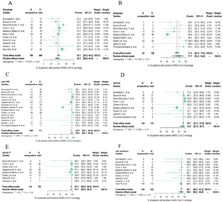 Résultats: Sur nos 123 patients (âge médian 66 ans écart interquartile (EI) 57–75), 69,9 % ont séroconverti après 2 doses de vaccination. Les patients ayant eu une séroconversion étaient plus âgés que ceux qui n’en ont pas eu. Les patients traités par rituximab sont ceux qui ont le moins répondu à la vaccination. Nous avons identifié 20 études de séroprévalence en plus de notre cohorte, représentant un total de 4423 patients dans 11 pays. La méta-analyse a confirmé un impact négatif sur le taux de séroconversion du rituximab et dans une moindre mesure de l’abatacept, du léflunomide et du méthotrexate.