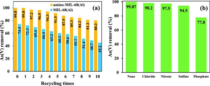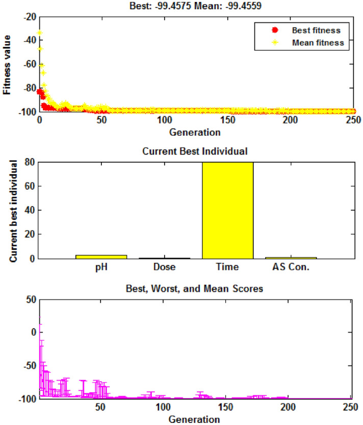 An amino-functionalized MIL-68(Al) metal-organic framework (amino-MIL-68(Al) MOF) was synthesized by solvothermal method and then characterized by FESEM, XRD, FTIR, EDX-mapping, and BET-BJH techniques. In order to predict arsenate (As(V)) removal, a robust quadratic model (R2 > 0.99, F-value = 2389.17 and p value < 0.0001) was developed by the central composite design (CCD) method and then the genetic algorithm (GA) was utilized to optimize the system response and four independent variables. The results showed that As(V) adsorption on MOF was affected by solution pH, adsorbent dose, As(V) concentration and reaction time, respectively. Predicted and experimental As(V) removal efficiencies under optimal conditions were 99.45 and 99.87%, respectively. The fitting of experimental data showed that As(V) adsorption on MOF is well described by the nonlinear form of the Langmuir isotherm and pseudo-second-order kinetic. At optimum pH 3, the maximum As(V) adsorption capacity was 74.29 mg/g. Thermodynamic studies in the temperature range of 25 to 50 °C showed that As(V) adsorption is a spontaneous endothermic process. The reusability of MOF in ten adsorption/regeneration cycles was studied and the results showed high reusability of this adsorbent. The highest interventional effect in inhibiting As(V) adsorption was related to phosphate anion. The results of this study showed that amino-MIL-68(Al) can be used as an effective MOF with a high surface area (> 1000 m2/g) and high reusability for As(V)-contaminated water.