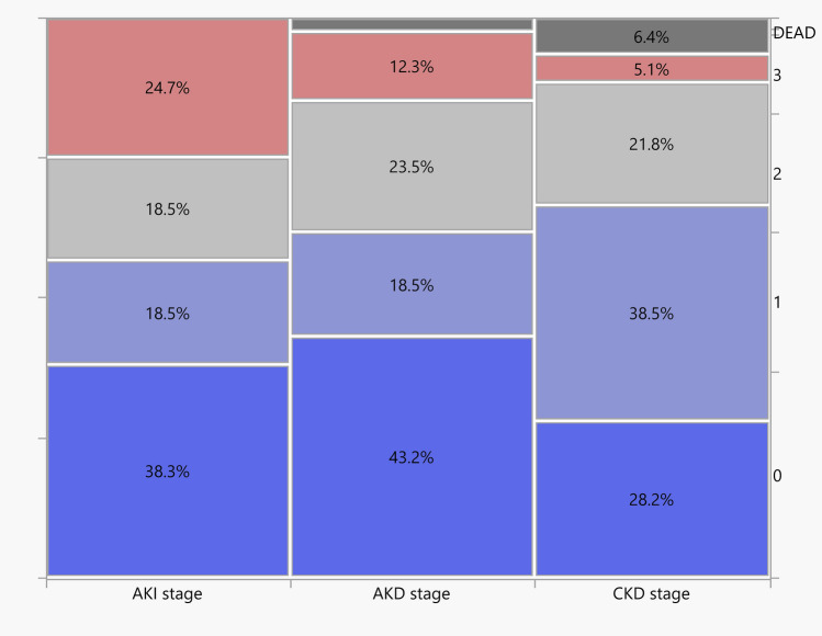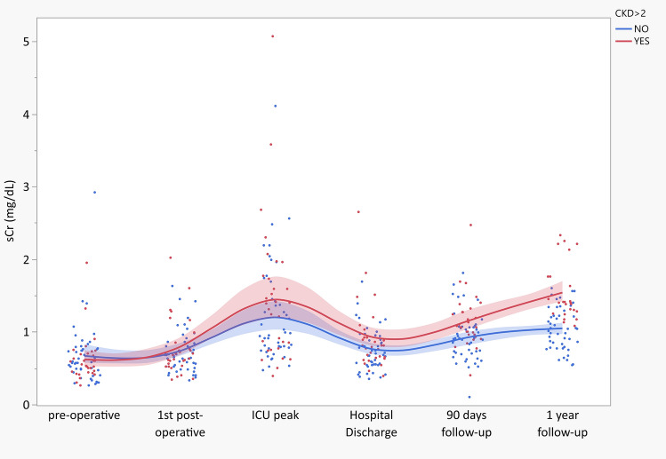 Results: Eighty-three patients were included. Creatinine peaked 3[2-4] days after transplantation, with 15(18%), 15(18%), and 20(24%) patients having post-operative AKI stages 1, 2, and 3, while 15(18%), 19(23%) and 10(12%) developed AKD stage 1, stage 2 and 3, respectively. Higher AKI stage was associated with worsening AKD (p = 0.009) and CKD (p = 0.015) stages. Of the 50 patients with AKI, 32(66%) transitioned to AKD stage > 0, and then 27 (56%) to CKD stage > 1. Female sex, extracorporeal membrane oxygenation support as a bridge to lung transplant and at the end of the surgery, the use of intraoperative blood components, and cold-ischemia time were associated with increased risk of post-operative AKI and AKD. Higher AKI stage prolonged invasive mechanical ventilation (p = 0.0001), ICU stay (p = 0.0001), and hospital stay (p = 0.0001), and increased the incidence of primary graft dysfunction (p = 0.035). Both AKI and AKD stages > 2 worsened long-term survival with risk ratios of 3.71 (1.34-10.2), p = 0.0131 and 2.65(1.02-6.87), p = 0.0443, respectively.
