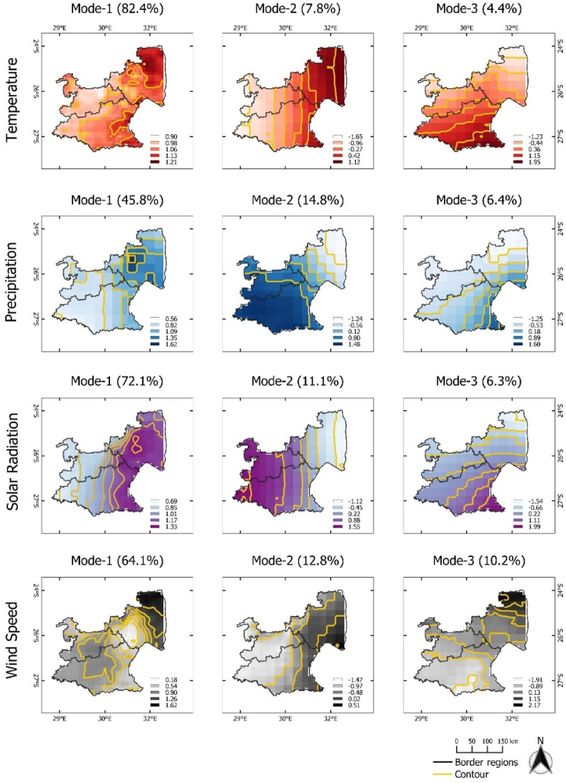 Climate change impacts on maize production in South Africa, i.e., interannual yield variabilities, are still not well understood. This study is based on a recently released reanalysis of climate observations (AgERA5), i.e., temperature, precipitation, solar radiation, and wind speed data. The study assesses climate change effects by quantifying the trend of agrometeorological indicators, their correlation with maize yield, and analyzing their spatiotemporal patterns using Empirical Orthogonal Function. Thereby, the main agrometeorological factors that affected yield variability for the last 31 years (1990/91-2020/21 growing season) in major maize production provinces, namely Free State, KwaZulu-Natal, Mpumalanga, and North West are identified. Results show that there was a significant positive trend in temperature that averages 0.03-0.04 °C per year and 0.02-0.04 °C per growing season. There was a decreasing trend in precipitation in Free State with 0.01 mm per year. Solar radiation did not show a significant trend. Wind speed in Free State increased at a rate of 0.01 ms-1 per growing season. Yield variabilities in Free State, Mpumalanga, and North West show a significant positive correlation (r > 0.43) with agrometeorological variables. Yield in KwaZulu-Natal is not influenced by climate factors. The leading mode (50-80% of total variance) of each agrometeorological variable indicates spatially homogenous pattern across the regions. The dipole patterns of the second and the third mode suggest the variabilities of agrometeorological indicators are linked to South Indian high pressure and the warm Agulhas current. The corresponding principal components were mainly associated with strong climate anomalies which are identified as El Niño and La Niña events.