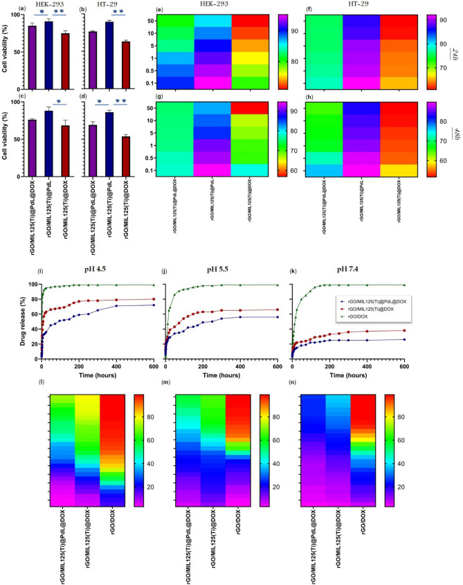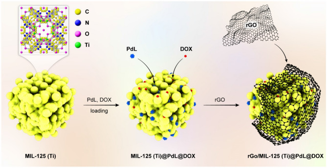 The aim of this work was to provide a novel approach to designing and synthesizing a nanocomposite with significant biocompatibility, biodegradability, and stability in biological microenvironments. Hence, the porous ultra-low-density materials, metal-organic frameworks (MOFs), have been considered and the MIL-125(Ti) has been chosen due to its distinctive characteristics such as great biocompatibility and good biodegradability immobilized on the surface of the reduced graphene oxide (rGO). Based on the results, the presence of transition metal complexes next to the drug not only can reinforce the stability of the drug on the structure by preparing π-π interaction between ligands and the drug but also can enhance the efficiency of the drug by preventing the spontaneous release. The effect of utilizing transition metal complex beside drug (Doxorubicin (DOX)) on the drug loading, drug release, and antibacterial activity of prepared nanocomposites on the P. aeruginosa and S. aureus as a model bacterium has been investigated and the results revealed that this theory leads to increasing about 200% in antibacterial activity. In addition, uptake, the release of the drug, and relative cell viabilities (in vitro and in vivo) of prepared nanomaterials and biomaterials have been discussed. Based on collected data, the median size of prepared nanocomposites was 156.2 nm, and their biological stability in PBS and DMEM + 10% FBS was screened and revealed that after 2.880 min, the nanocomposite's size reached 242.3 and 516 nm respectively. The MTT results demonstrated that immobilizing PdL beside DOX leads to an increase of more than 15% in the cell viability. It is noticeable that the AST:ALT result of prepared nanocomposite was under 1.5.