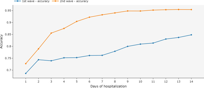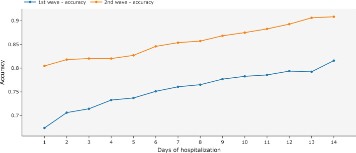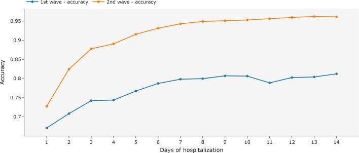 Results: Time series-based machine learning models are capable of predicting a COVID-19 patient's outcome with up to 96% general accuracy and 81% accuracy considering only the first hospitalization day. The models can reach up to 99% sensitivity (discharge prediction) and up to 91% specificity (death prediction).