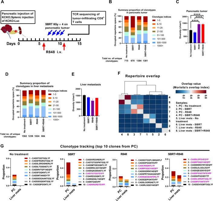 Results: We demonstrated that intravenous administration of the TLR7/8 agonist R848, in combination with local SBRT, leads to superior tumor control compared with either treatment alone. The combination of R848 and SBRT results in significant immune activation of the pancreatic TME, including increased tumor antigen-specific CD8+ T cells, decreased regulatory T cells, and enhanced antigen-presenting cells maturation, as well as increased interferon gamma, granzyme B, and CCL5 along with decreased levels of interleukin 4 (IL-4), IL-6, and IL-10. Importantly, the combination of SBRT and systemic R848 also resulted in similar immunostimulatory changes in liver metastases, leading to improved metastatic control. CD8+ T cell depletion studies highlighted the necessity of these effector cells at both the local and hepatic metastatic sites. T cell receptor (TCR) clonotype analysis indicated that systemic R848 not only diversified the TCR repertoire but also conditioned the metastatic foci to facilitate entry of CD8+ T cells generated by SBRT therapy.