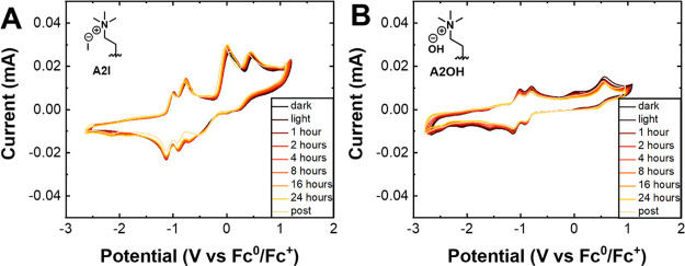 Perylene diimides (PDIs) have garnered attention as organic photocatalysts in recent years for their ability to drive challenging synthetic transformations, such as aryl halide reduction and olefin iodoperfluoroalkylation. Previous work in this area employs spectator pendant groups attached to the imide nitrogen positions of PDIs that are only added to impart solubility. In this work, we employ electron-rich ammonium iodide or ammonium hydroxide pendant groups capable of self-n-doping the PDI core to form radical anions (R •- ) and dianions (D ••2- ). We observe R •- formation is favored at low concentrations where aliphatic linkers are able to freely rotate, while D ••2- formation is favored at elevated concentrations likely due to Coulombic stabilization between adjacent chromophores in a similar manner to that of Kasha exciton stabilization. Cyclic voltammetric measurements are consistent with steric encumbrance increasing the Lewis basicity of anions through Coulombic destabilization. However, sterics also inhibit dianion formation by disrupting aggregation. Finally, femtosecond transient absorption measurements reveal that low wavelength excitation (400 nm) preferentially favors the excitation of R •- to the strongly reducing doublet excited state 2[R •- ]*. In contrast, higher wavelength excitation (520 nm) favors the formation of the singlet excited state 1[N]*. These findings highlight the importance of dopant architecture, counterion selection, excitation wavelength, and concentration on R •- and D ••2- formation, which has substantial implications for future photocatalytic applications. We anticipate these findings will enable more efficient systems based on self-n-doped PDIs.