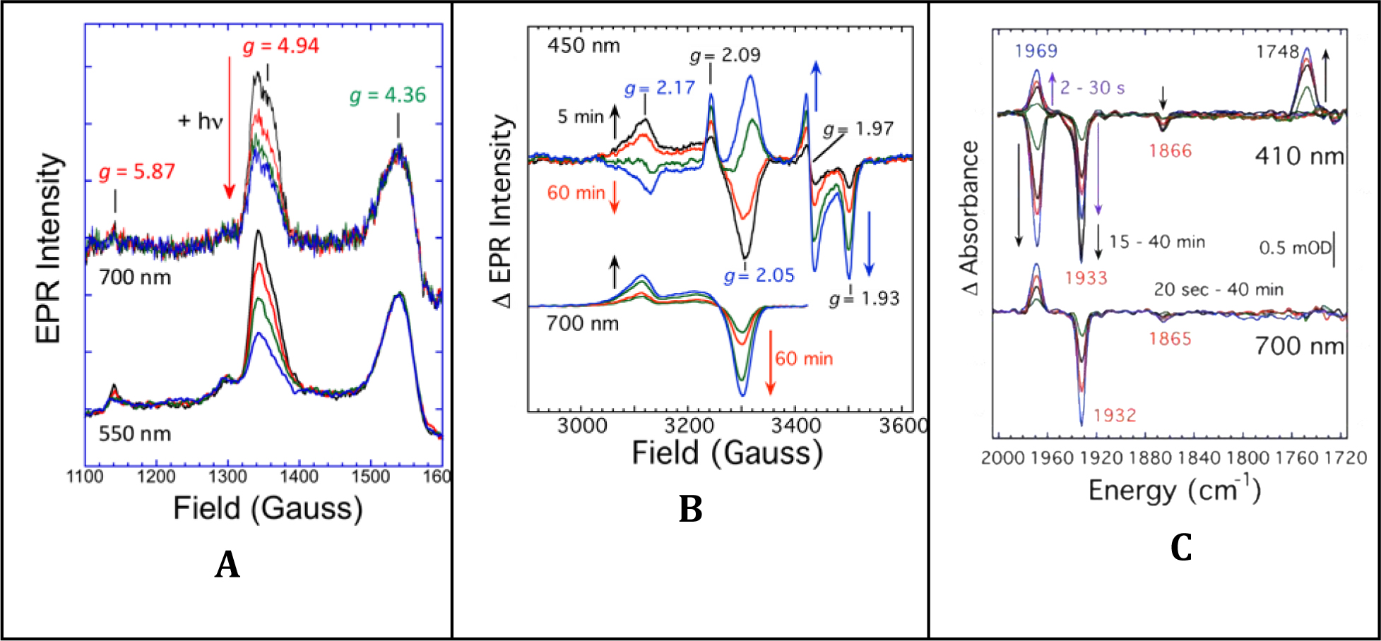 CO-bound forms of nitrogenase are N2-reduction inhibited and likely intermediates in Fischer-Tropsch chemistry. Visible-light photolysis at 7 K was used to interrogate all three known CO-related EPR-active forms as exhibited by the α-H195Q variant of Azotobacter vinelandii nitrogenase MoFe protein. The hi(5)-CO EPR signal converted to the hi-CO EPR signal, which reverted at 10 K. FT-IR monitoring revealed an exquisitely light-sensitive "Hi-2" species with bands at 1932 and 1866 cm-1 that yielded "Hi-1" with bands at 1969 and 1692 cm-1, which reverted to "Hi-2". The similarities of photochemical behavior and recombination kinetics showed, for the first time, that hi-CO EPR and "Hi-1" IR signals arise from one chemical species. hi(5)-CO EPR and "Hi-2" IR signals are from a second species, and lo-CO EPR and "Lo-2" IR signals, formed after prolonged illumination, are from a third species. Comparing FT-IR data with CO-inhibited MoFe-protein crystal structures allowed assignment of CO-bonding geometries in these species.