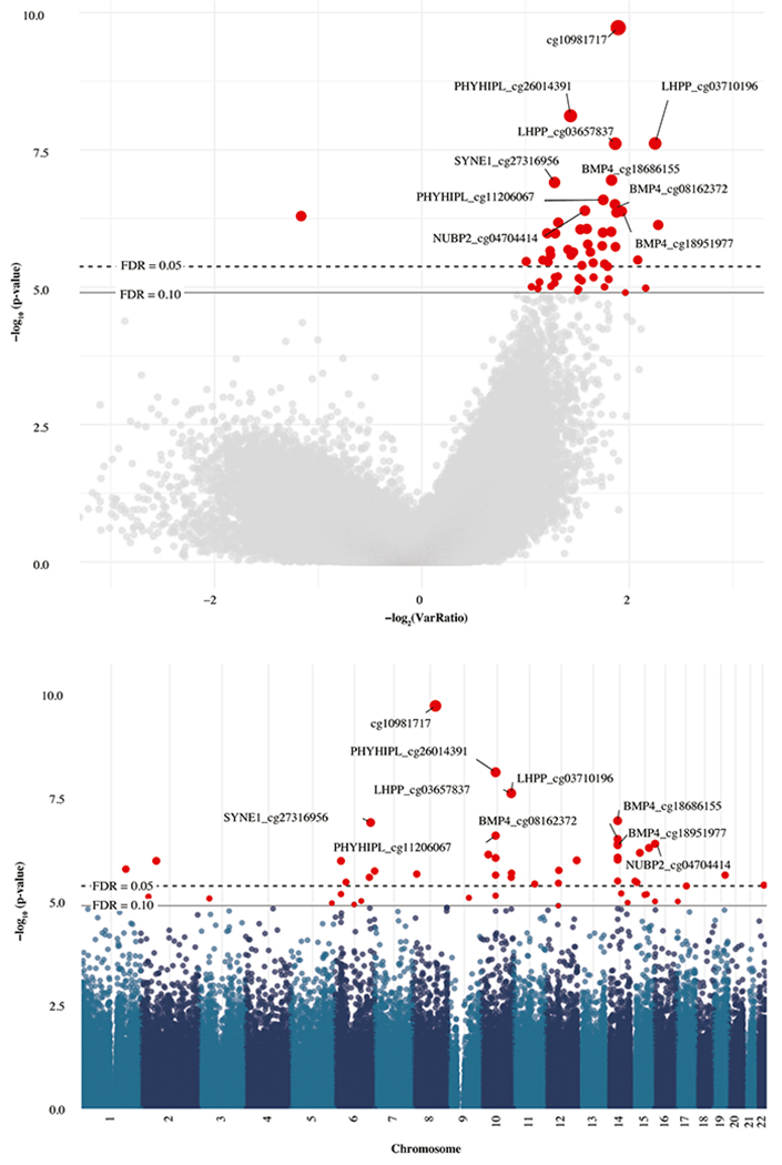 Results: One hundred and fifty-nine (71.3%) pregnant women reported no history of asthma (never asthma), 15 (6.7%) reported inactive, and 49 (22%) reported active antenatal asthma. Women predominantly self-identified as Black/Hispanic Black [88 (39.5%)] and Hispanic/non-Black [42 (18.8%)]. We identified 10 probes at FDR<0.05 and 4 probes at FDR<0.10 characterized by higher variability in maternal active asthma compared to never asthma mapping to GPX3, LHPP, PECAM1, ATAD3C, and ARHGEF4 and 2 probes characterized by lower variation mapping to CHMP4A and C5orf24. Amongst women with inactive asthma, we identified 52 probes, 41 at FDR<0.05 and an additional 11 at FDR <0.10, with higher variability compared to never asthma; BMP4, LHPP, PHYHIPL, and ZSCAN23 were associated with multiple DVPs. No associations were observed with DMPs.