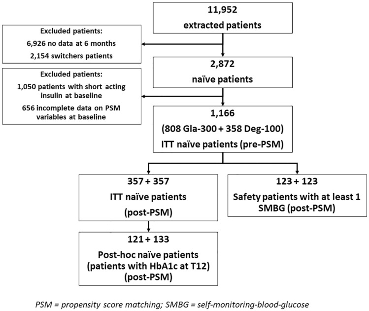 Results: Nineteen centers provided data on 357 patients in each PSM cohort. HbA1c after 6 months (primary endpoint) decreased by - 1.70% (95%CI - 1.90; - 1.50) in Gla-300 group and - 169% (95%CI - 1.89; - 1.49) in Deg-100 group, confirming non-inferiority of Gla-300 versus Deg-100. Fasting blood glucose (BG) decreased by ~60 mg/dl in both groups; body weight remained unchanged. In both groups, the mean starting dose was 12U (0.15U/kg) and it was slightly titrated to 16U (0.20U/kg). IR (episodes per patient-months) of BG ≤70 mg/dl was 0.13 in Gla-300 group and 0.14 in Deg-100 group (p=0.87). IR of BG <54 mg/dL was 0.02 in both groups (p=0.49). No severe hypoglycemia occurred.