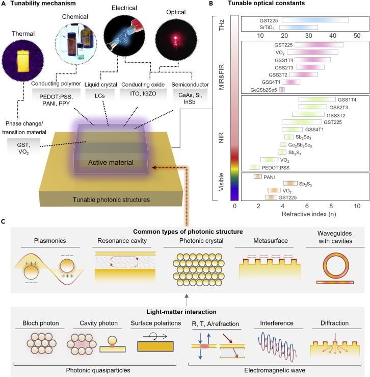 The next frontier of photonics is evolving into reconfigurable platforms with tunable functions to realize the ubiquitous application. The dynamic control of optical properties of photonics is highly desirable for a plethora of applications, including optical communication, dynamic display, self-adaptive photonics, and multi-spectral camouflage. Recently, to meet the dynamic response over broad optical bands, optically active materials have been integrated with the diverse photonic platforms, typically in the dimension of micro/nanometer scales. Here, we review recent advances in tunable photonics with controlling optical properties from visible to terahertz (THz) spectral range. We propose guidelines for designing tunable photonics in conjunction with optically active materials, inherent in wavelength characteristics. In particular, we devote our review to their potential uses for five different applications: structural coloration, metasurface for flat optics, photonic memory, thermal radiation, and terahertz plasmonics. Finally, we conclude with an outlook on the challenges and prospects of tunable photonics.