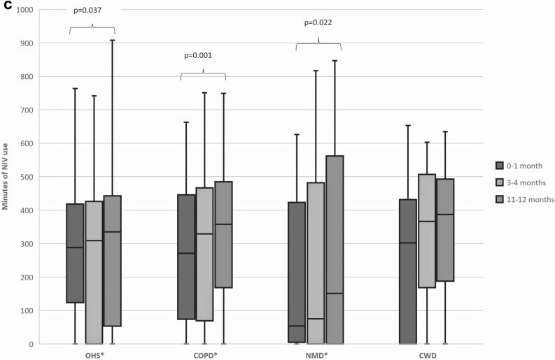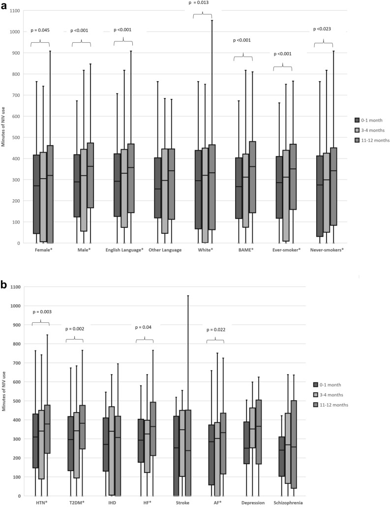 Few international studies have investigated factors affecting domiciliary non-invasive ventilation (D-NIV) compliance, and data from the UK are limited. We assessed compliance (defined as ≥ 4 h/night for at least 70% of the time) in a retrospective UK population study, at three time points (0-1 month, 3-4 months and 11-12 months), for all patients commenced on D-NIV over a 5-year period. A total of 359 patients were included. Non-compliant vs. compliant patients were significantly younger (median age 64 (IQR 52-72) vs. 67 (58-75) years, p = 0.032) and more likely to have schizophrenia, consistent at both 3-4 months (5% vs. 1%, p = 0.033) and 11-12 months (5% vs. 2%, p = 0.049). Repeated measures ANOVA demonstrated that the minutes [median (IQR)] of D-NIV used significantly increased at the three time points (0-1 month, 3-4 months and 11-12 months) for patients with hypertension [310 (147.5-431) vs. 341 (89-450) vs. 378 (224.5-477.5), p = 0.003]; diabetes [296.5 (132.5-417.5) vs. 342.5 (94.5-438.5) vs. 382 (247.5-476.25), p = 0.002] and heart failure [293 (177-403) vs. 326 (123-398) vs. 365 (212-493), p = 0.04]. In conclusion, younger and comorbid schizophrenic patients have lower D-NIV compliance rates, and our data suggest that persistence with D-NIV over a year may improve overall use.
