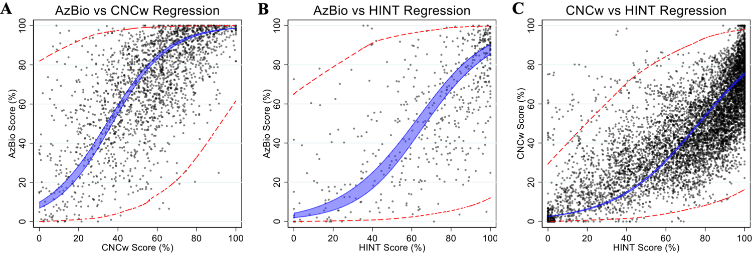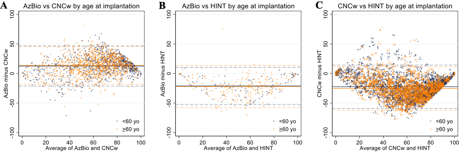 Study design: Arizona Biomedical (AzBio) Sentence Test, Consonant-Nucleus-Consonant word (CNCw), and Hearing in Noise Test (HINT) scores in quiet for the implanted ear were collected for individuals who received a CI between 1985 and 2019. Scores collected during the same testing session were analyzed using Bland-Altman plots to assess agreement between testing methods. Simple linear regression with logit transformation was used to generate predictive functions and 95% confidence intervals for expected mean and individual scores.