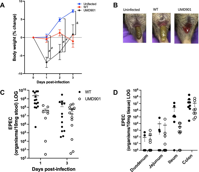 Bundle-forming pili (BFP) are implicated in the virulence of typical enteropathogenic E. coli (EPEC), resulting in enhanced colonization and mild to severe disease outcomes; hence, non-functional BFP may have a major influence on disease outcomes in vivo. Weaned antibiotic pre-treated C57BL/6 mice were orally infected with EPEC strain UMD901 (E2348/69 bfpA C129S); mice were monitored daily for body weight; stool specimens were collected daily; and intestinal tissues were collected at the termination of the experiment on day 3 post-infection. Real-time PCR was used to quantify fecal shedding and tissue burden. Intestinal inflammatory biomarkers lipocalin-2 (LCN-2) and myeloperoxidase (MPO) were also assessed. Infection caused substantial body weight loss, bloody diarrhea, and intestinal colonization with fecal and intestinal tissue inflammatory biomarkers that were comparable to those previously published with the wild-type typical EPEC strain. Here we further report on the evaluation of an EPEC infection model, showing how disruption of bfp function does not impair, and may even worsen diarrhea, colonization, and intestinal disruption and inflammation. More research is needed to understand the role of bfp in pathogenicity of EPEC infections in vivo.