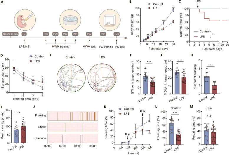 Methods: Neonatal severe inflammation was established by intraperitoneal injection of high dose lipopolysaccharide (LPS, 1 mg kg-1) in postnatal day 3 (P3) rats. The Morris water maze task and fear conditioning test were used to investigate long-term cognitive functions. ELISA, RT-PCR and Western blotting were used to examine the expression levels of proinflammatory cytokines and KCC2. Perforated patch-clamping recordings were used to determine the GABAergic shift.