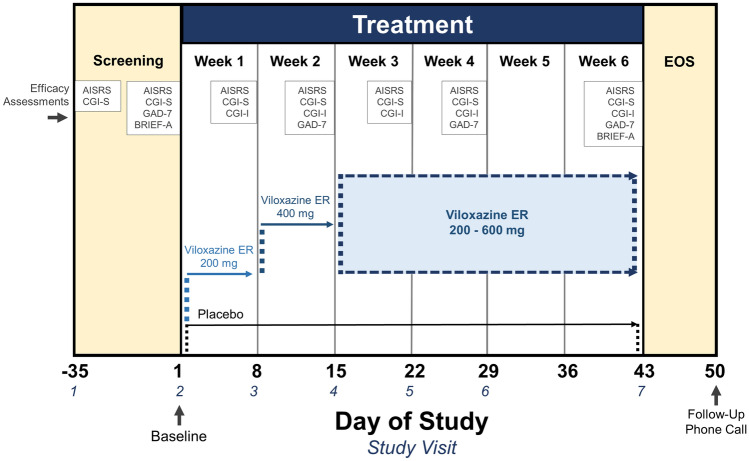 Methods: This was a phase III, randomized, double-blind, placebo-controlled, two-arm trial in adults (18-65 years of age) with attention-deficit/hyperactivity disorder. Eligible subjects were randomized 1:1 to viloxazine ER (flexible dose of 200-600 mg/day) or matched placebo. The primary efficacy endpoint was the change from baseline at end of study (week 6) in the Adult ADHD Investigator Symptom Rating Scale (AISRS) total score. The key secondary endpoint was the change from baseline at end of study in the Clinical Global Impressions-Severity of Illness (CGI-S) score. Additional secondary outcome measures included the AISRS Inattention and Hyperactivity/Impulsivity subscales, the Behavior Rating Inventory of Executive Function-Adult (BRIEF-A), the Generalized Anxiety Disorder-7 Item (GAD-7), and the Clinical Global Impressions-Improvement (CGI-I); each was analyzed at end of study. Responder rates on CGI scales and the AISRS were also assessed.