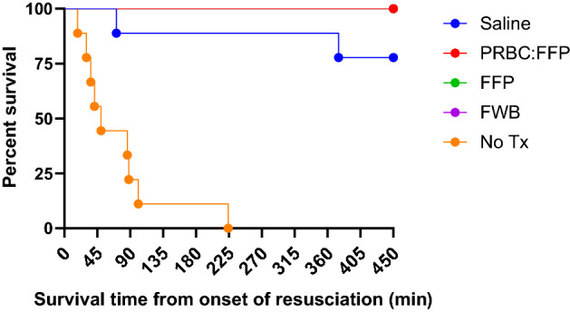 Results: Survival time was significantly shorter for Group 1 compared to the other groups (P < 0.05). Despite the same triggers for resuscitation when compared to blood/blood components, saline was associated with a shorter survival time (P = 0.145), greater pathophysiological burden and significantly greater resuscitation fluid volume (P < 0.0001).
