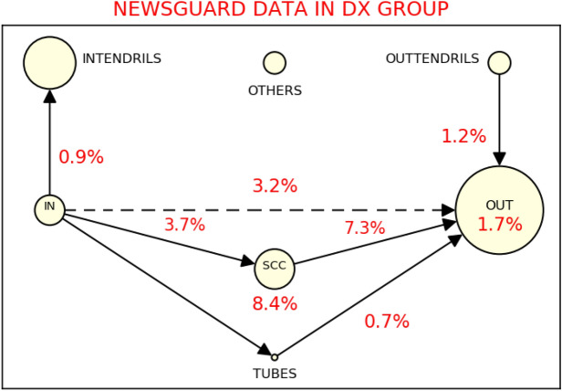 Bow-tie structures were introduced to describe the World Wide Web (WWW): in the direct network in which the nodes are the websites and the edges are the hyperlinks connecting them, the greatest number of nodes takes part to a bow-tie, i.e. a Weakly Connected Component (WCC) composed of 3 main sectors: IN, OUT and SCC. SCC is the main Strongly Connected Component of WCC, i.e. the greatest subgraph in which each node is reachable by any other one. The IN and OUT sectors are the set of nodes not included in SCC that, respectively, can access and are accessible to nodes in SCC. In the WWW, the greatest part of the websites can be found in the SCC, while the search engines belong to IN and the authorities, as Wikipedia, are in OUT. In the analysis of Twitter debate, the recent literature focused on discursive communities, i.e. clusters of accounts interacting among themselves via retweets. In the present work, we studied discursive communities in 8 different thematic Twitter datasets in various languages. Surprisingly, we observed that almost all discursive communities therein display a bow-tie structure during political or societal debates. Instead, they are absent when the argument of the discussion is different as sport events, as in the case of Euro2020 Turkish and Italian datasets. We furthermore analysed the quality of the content created in the various sectors of the different discursive communities, using the domain annotation from the fact-checking website Newsguard: we observe that, when the discursive community is affected by m/disinformation, the content with the lowest quality is the one produced and shared in SCC and, in particular, a strong incidence of low- or non-reputable messages is present in the flow of retweets between the SCC and the OUT sectors. In this sense, in discursive communities affected by m/disinformation, the greatest part of the accounts has access to a great variety of contents, but whose quality is, in general, quite low; such a situation perfectly describes the phenomenon of infodemic, i.e. the access to "an excessive amount of information about a problem, which makes it difficult to identify a solution", according to WHO.