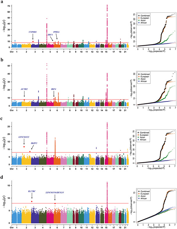 To identify new susceptibility loci to lung cancer among diverse populations, we performed cross-ancestry genome-wide association studies in European, East Asian and African populations and discovered five loci that have not been previously reported. We replicated 26 signals and identified 10 new lead associations from previously reported loci. Rare-variant associations tended to be specific to populations, but even common-variant associations influencing smoking behavior, such as those with CHRNA5 and CYP2A6, showed population specificity. Fine-mapping and expression quantitative trait locus colocalization nominated several candidate variants and susceptibility genes such as IRF4 and FUBP1. DNA damage assays of prioritized genes in lung fibroblasts indicated that a subset of these genes, including the pleiotropic gene IRF4, potentially exert effects by promoting endogenous DNA damage.